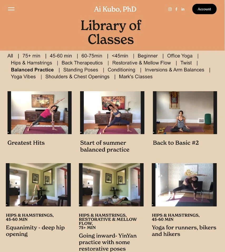 Known for her crystal clear instructions and knowledge of yoga philosophy, biomechanics, and health, Ai is a highly regarded yoga teacher in the San Francisco Bay Area.