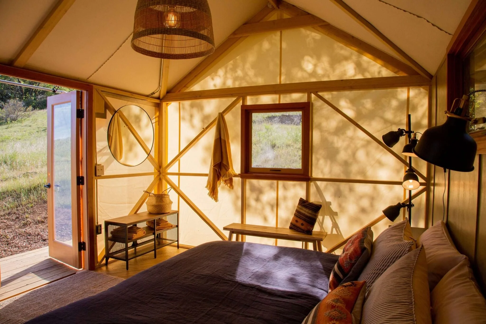 More spacious than the glamping tent. Each contains a king bed or two single bed. Bathrooms and showers located in the nearby Bath House. Very quiet and private.